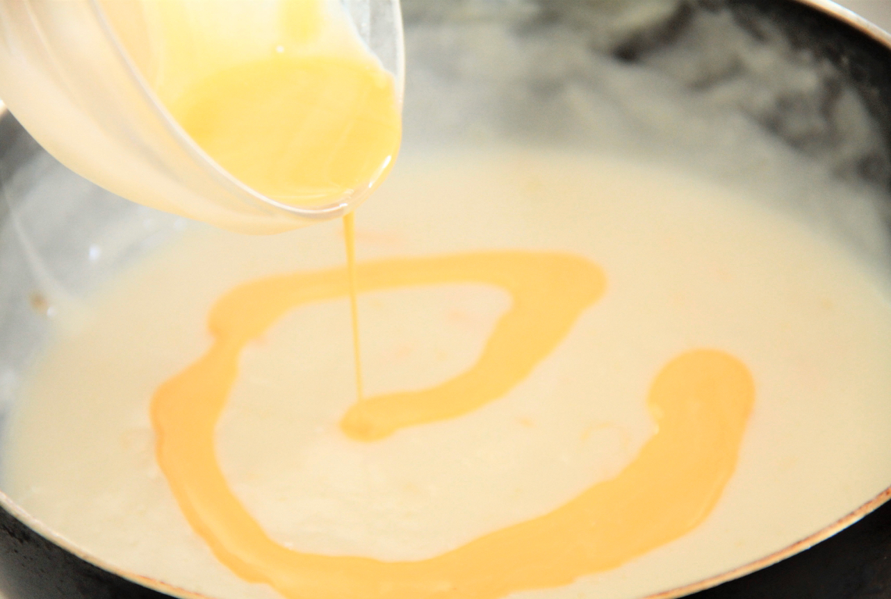 レモン果汁少量と卵黄、クリーム (食品)を加える。
