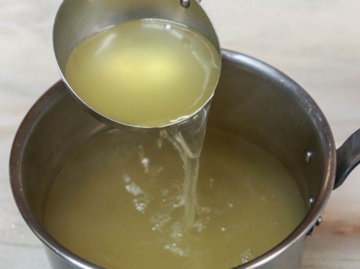 エシャロット、白ワイン、レモン果汁と家禽を魚のヴルーテに加える。